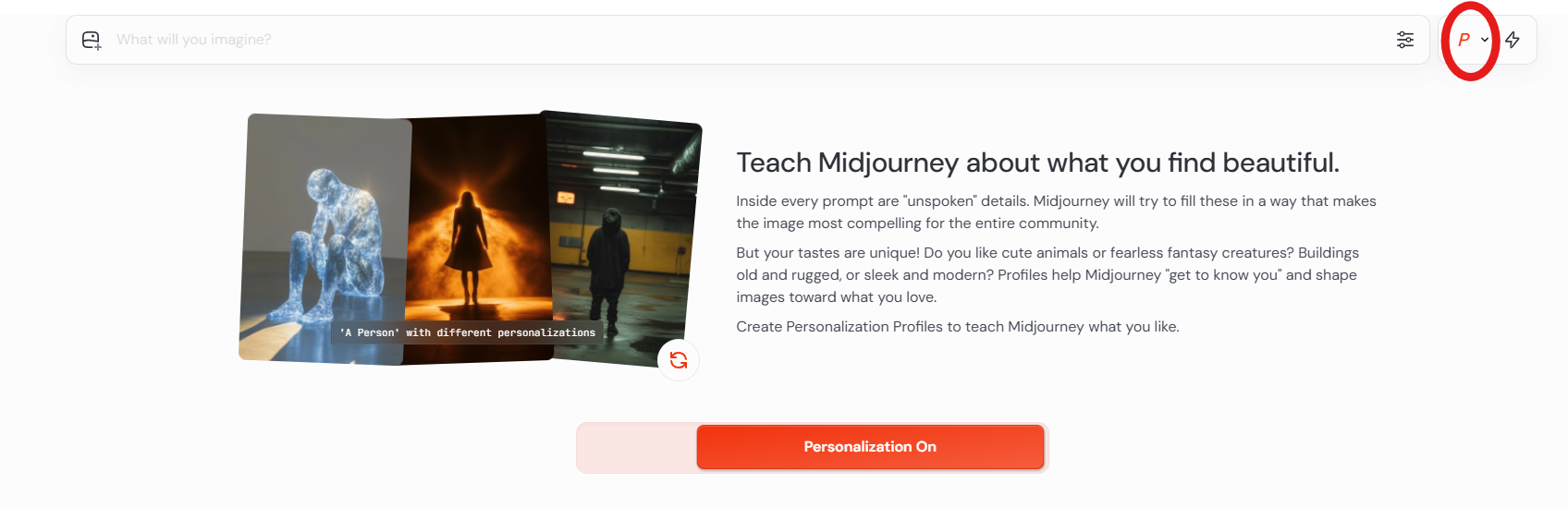Personalize 기능을 온전히 활용하기 위해서는 왼쪽 메뉴 중 Personalize를 선택한 후에 나의 선택에 따른 미드지니의 학습 과정이 필요합니다. 미드저니 프로그램에서 제시되는 두 개의 그림 중 마음에 드는 그림을 선택하는 작업을 총 200번 진행해야 해요. 만약 두 이미지 모두 마음에 들지 않는다면 '건너뛰기(skip)'를 할 수 있으며, 건너뛴 횟수만큼 더 이미지를 선택하여 최종적으로 200번의 선택을 완료해야 합니다. 이 200번의 선택이 끝나면, 그때부터 당신의 고유한 Personalize 스타일이 반영된 이미지를 생성할 수 있게 됩니다. 이 과정은 미드저니가 당신의 시각적 선호도를 깊이 이해하는 데 필수적인 단계입니다. 아래 이미지에서처럼 프롬프트 입력란 오른쪽에 P를 선택하여 활성화시키면 빨간색 P로 바뀌면서 활성화가 됩니다. 활성화를 끄려면 다시 한번 더 누르면 글자색상이 검정색으로 바뀌면서 비활성화가 됩니다.