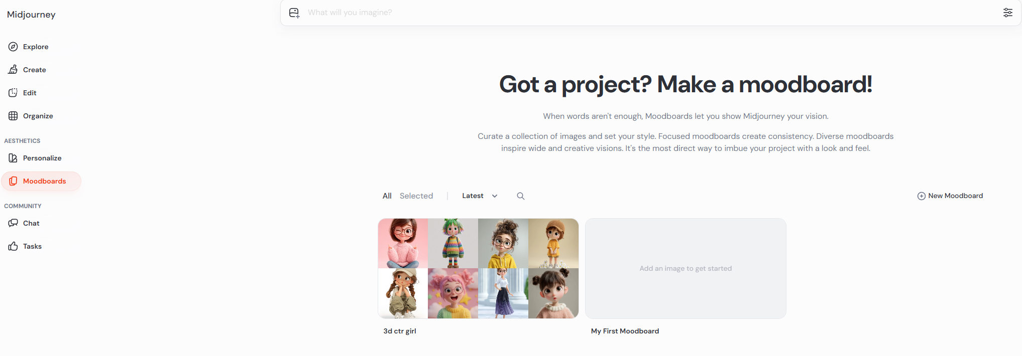 디자인이나 아트 작업을 해보신 분들이라면 '무드보드'의 중요성을 잘 아실 거예요. 미드저니의 Moodboards 기능은 이러한 컨셉 시각화 작업을 AI의 영역으로 확장시켰습니다. 여러 이미지를 조합하여 특정 분위기, 색감, 스타일을 AI에게 전달하는 방식이죠. 저는 3D캐릭터 걸의 이미지를 골라서 저만의 무드보드를 생성해 보았습니다. 새로운 무드보드를 생성하기 위해서는 우측의 플러스 버튼 옆의 New Moodboard를 눌러서 만드시면 됩니다. 이렇게 생성한 무드보드의 이름은 자유롭게 만들어 주면 되는데 한글로 이름을 지어도 됩니다.